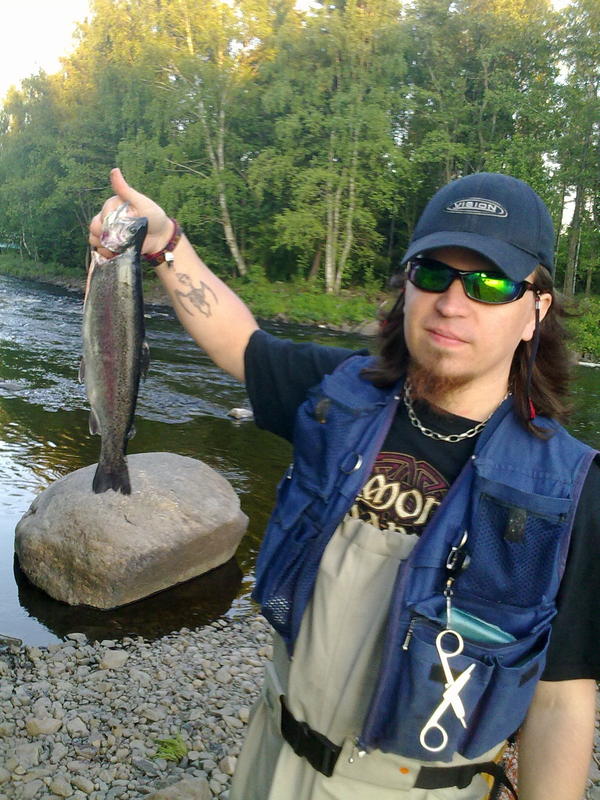 Olimme pitäneet noin reilun viikon kalastustauon Peten kanssa sateiden vuoksi, ja nyt kelien parannuttua olimme taas matkalla merikarvianjoelle. Köffiltä hiukan limpparia ja siitä sitten lankoskelle. Pete nopeampana ampaisi heti melko varmana ottipaikkana pidettyyn monttuun hiukan laavulta ylöspäin mutta joutui toteamaan ettei hänen perhojaan huolittu tänään. Itse larvastelin hiukan alempaa tarkasti kaikki poterot ja montuntapaiset läpi, saamatta muuta kuin pari särkeä. Siitä me Peten kanssa jatkoimme ronkkimista pikkuhiljaa alaspäin, minä toisella puolella jokea kuin Pete. Särkiä sai nostella vähän väliä ylös, kunnes Pete sai ensimmäisen pienen noin 25cm taimenen, millä oli metallilätkä numerosarjalla varustettuna selässä. Hiukan siirryttyämme olimme ensimmäisessä mutkassa, ja minullakin vapa taipui, ja vaikka pieni kala olikin, tunsin heti ettei kyseessä ollut särki, vaan noin 20cm kaunis harjus. Yhtä poteroa alempaa ehdein muutaman heiton heittää ja taas vapa taipui, ja tällä kertaa kyseessä oli noin25cm taimen. Sen jälkeen kalastimme rauhallisempaa kohtaa sillan kohdalla, mutta ainoastaan särjet hyväksyivät perhoni. Hyttysiä oli niin järkyttävän paljon kimpussani että suuri osa ajasta meni niiden hätistelyyn. Pete oli fiksuna miehenä melkein uittanut itsensä off:iin, eikä hän edes huomannut hyttysten läsnäoloa. Lankosken hiljaisuuden vuoksi ehdotin Petelle jos mentäisiin stäävit&vaadit koskea kalastamaan ja hänelle se sopi.
