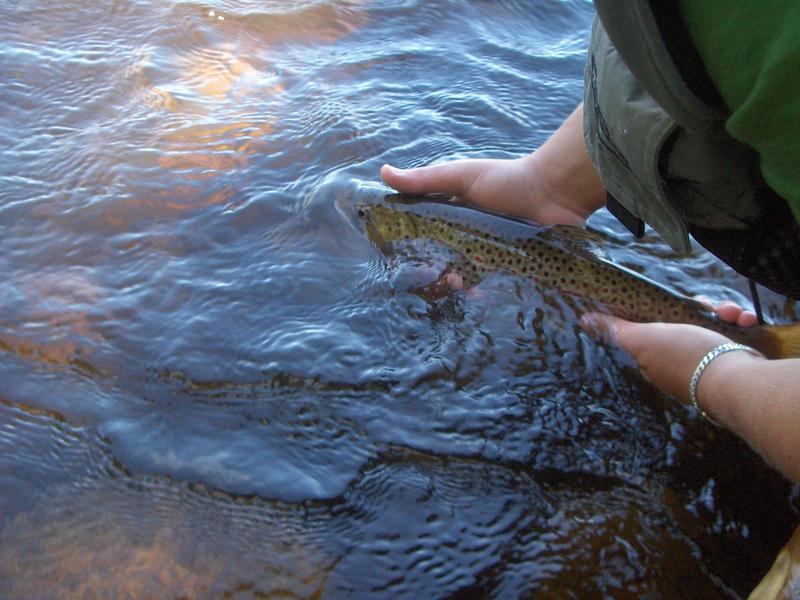 Pienen tuumaustauon jälkeen takaisin niskalle ja mietimme kaverin kanssa että mitä perhoa sitä oikein taas kokeilisi. Silmään sattui 12# koukkuun sidottu humpy, ja ei muuta kuin heittelemään. Ja ei tarvinnut kauaa odottaa! Toisella heitolla tarttui! Kala haaviin ja mittaa kalalla oli 36cm. Luonnollisesti pääsi kasvamaan.