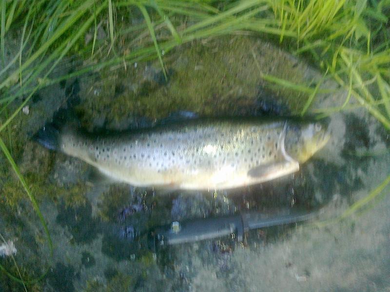 tunnin ja lukuisten heittojen jälkeen alkoi tuntua siltä että taisipa olla mies oikeassa, mutta jatkoinpa silti kalastelua. Jonkin ajan päästä tuli kuitenkin tärppi, ja matalaan veteen kalan tuotuani huomasin että kyseessä oli alamittainen taimen, jotakuinkin 36-37cm pitkä.