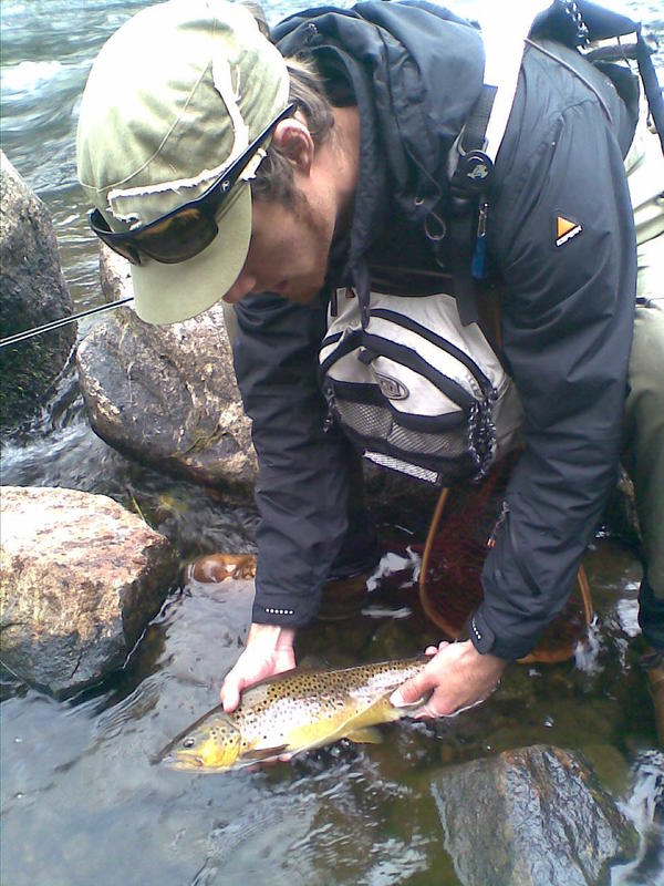 Taas yksi kalalaji omaan saaliskategoriaan. Hymyn se sai aikaan. Hiljasta oli seuraavat pari tuntia ja vaihdettiinkin 3 paikalle makkaran puraisun jälkeen. Saapuessamme 3 paikalle nähtiin kun eräs kalastaja irrotti juuri saamaansa mitallista taimenta perhostaan ja tämähän lämmitti mieltäni, sekä nosti toiveita ensimmäisestä mitta taimenesta. Lähdimme myllykosken sillalta uittamaan alaspäin ja noin puolen tunnin päästä vapa heilahti voimakkaasti, pelon ja ilon sekainen fiilis nousi pintaan kun tajusin että nyt on "iso" taimen kiinni ja se pitäisi vielä väsytellä ja suostutella haaviin. Tovin taistelun kuluttua se oli totta, haavissani lojui kaunis 47cm luonnon taimen, nopeat kuvaukset ja kala sai vapautensa. Kyllä jäi hyvä mieli tästä reissusta. Kiitokset eräälle kalastajalle joka suositteli perhoa jolla taimen nousi. Hares ear kuulapää.