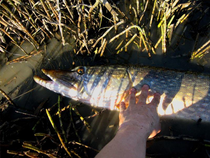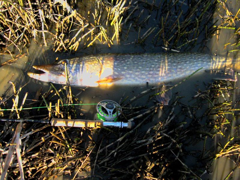 Päätin kokeilla kaislikon edustalta avovedestä josko siellä olisi nähty enemmän nälkää. Vaihdoin perhoksi paksuprofiilisen, mutta melko lyhyen kettusidoksen. Jo kolmannella heitolla siimassa tuntui hyvä vetäisy, mutta vastaiskuni jäi vain vavan nostamiseksi ja kala pakeni. Sain heitellä rauhassa vielä noin 20 kertaa, kunnes jytkähti. Vastaiskukin onnistui vähän paremmin, mutta taas veti kala pitemmän korren. Kaksi potkua, pyörähdys pinnassa ja irti. GNÄÄHJ!!!! Fisu olisi ollut varmaankin 5 kg:n paremmalla puolella. Heittelin vielä hetken tuloksetta ennen kuin vaihdoin pyydökseni keltaisen craft fur/fluorofibre -sidoksen, jossa oli mustat poikkiraidat. Parin heiton jälkeen perhoni pysähtyi johonkin. Edellisen tärpin täpinöissäni tein kunnon vastaiskun. Ensin ajattelin, että olin saamassa uppotukkia saaliikseni, mutta kun siimaa lähdettiin vastapelurin toimesta viemään päättäväisesti minusta poispäin, tajusin asian oikean laidan. Koukussa oli reilusti isompi hauki, mitä olin ikinä pidellyt. Kala vei siimaa miten tykkäsi, eikä minulla taistelun alkumetreillä ollut mitään sanomista asiaan. Noin kolmen minuutin jälkeen kala alkoi kuitenkin väsyä. Puoliksi kantaen, puoliksi työntäen sain kalan rantaveteen sellaiseen kohtaan, ettei se pääsisi kaislojen vuoksi pakenemaan. Hain kameran, mitan, puntarin ja pakasteletkua repustani. Kala oli 107 cm pitkä! Ajattelin laittaa kalan pakasteletkun sisään punntakseni sen, mutta se oli liian paksu. Askartelin letkusta hienot valjaat, jolla yritin punnita kalaa. Digitaalipuntarini ehti näyttää 7,45 kg ennen kuin kala alkoi luisumaan irti. En yrittänyt uutta punnitusta, koska hauki oli ollut rantavedesä jo pari minuuttia enkä uskonut sen saavan kovin hyvin happea. Kahlasin takaisin kaislikon läpi avoveden äärelle ja elvyttelin kalaa noin minuutin verran, kunnes kala oli vironnut tarpeeksi ja potkaisi itsensä takaisin syvyyksiin.