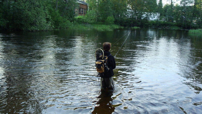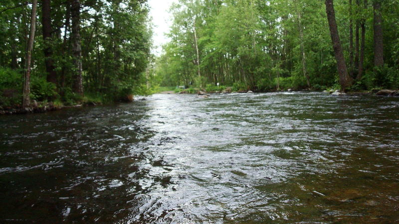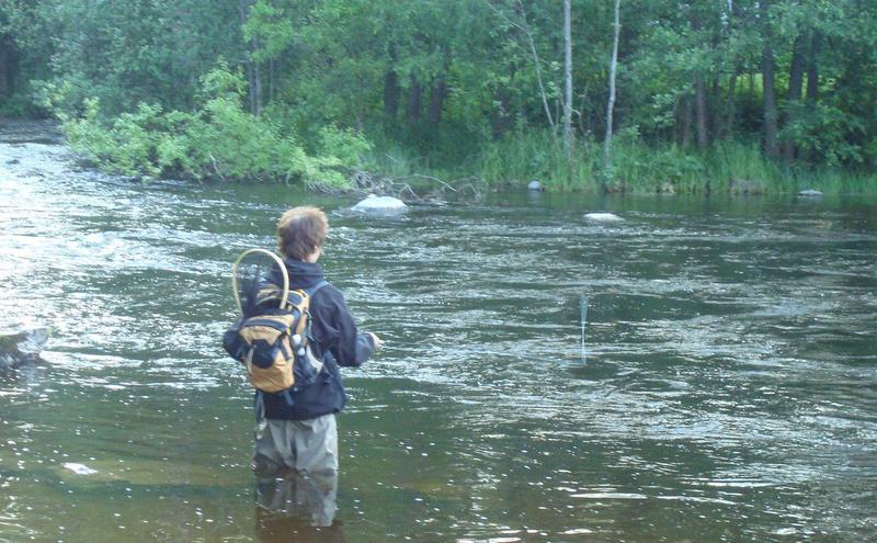 Aloitin kalastuksen kello 20.00 mutkasta ennen suvantoa. Larvastin mutkan perusteellisesti, mutta kalat eivät ottaneet. Päätin siirtyä ylempään mutkaan ja huomasin että mutkassa oli jo kalastajia ja päätin etten lähde sinne häiritsemään muiden kalastusta, joten siirryin vielä ylöspäin, mutkaan ennen rauhoitusaluetta. Kun saavuin mutkalle huomasin, että puu oli kaatunut koskeen ja ajattelin että sen alla voisi olla kalaa. Heitin larvat ylävirtaan ja uitin puun ali. Viides uitto puun ali tuotti tulosta kille nappasi kiinni larvaan ja lähti viemään siimaa. Ensiksi yritin pitää kalaa kovasti hiljasemmassa virrassa ettei vaan lähtisi koskea alas, mutta kun ei niin ei. Kala pääsi koskeen ja mie kömmin perästä. Kun koskea oltiin menty jonkun matkaa alaspäin ja tuli pieni kohta, jossa virta ei ollut niin kova päätin että haavitan kalan siinä. Kala suostui haaviin. Noin 45 cm kirre suht pulskassa kunnossa. Kun olin saanut kalan haaviin ja otin perhon pois kalan suusta huomasin että oli siimat menneet poikki. Oli varmaan hiertänyt kiviin koskessa. Kalan perkaus ja uudet perukkeet ja perhot kiinni.
