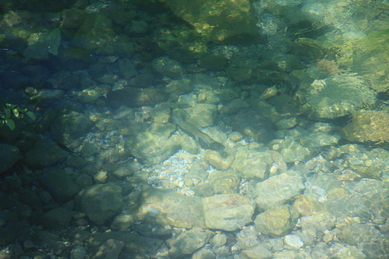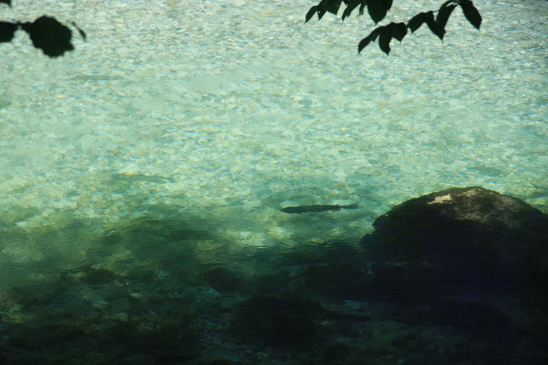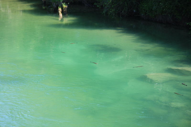 Tuli siinä sitten ajettua muutama vanha paikkakin läpi, kävin kurkistelemassa olosuhteita mm. Brodin yläpuolella ja hitto vieköön että oli nätissä tilassa se joki, aivan käsittämättömän kaunista suorastaan (se mutkapaikka, siitä oli purettu hyppylauta pois ja alas kiville pääsi nyt tikkaita pitkin). Jatkoin tutkimista Brodin kylään johtavan sillan kohdilta, siitä padon yläpuolelta ja näin vedessä aika komeita yksilöitä uiskentelemassa, mieli olisi tehnyt taas mennä sinne kalaan, mutta nyt oli lupa alimmalle, ns. Bledin alueelle.