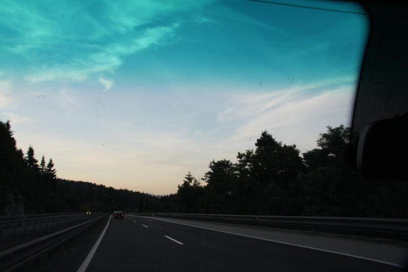 Aamunkoite oli jotain aivan mahtavaa, taivaanranta oli violetin usvainen ja pilvet hyväilivät ja halasivat vuorten rinteitä kuin postikorteissa joskus voi nähdä, no mitenkäs otat tuulilasin läpi 140km/h vauhdissa hienoja kuvia, saatikka kaivat kameraa leipä suussa/kädessä.