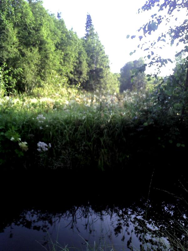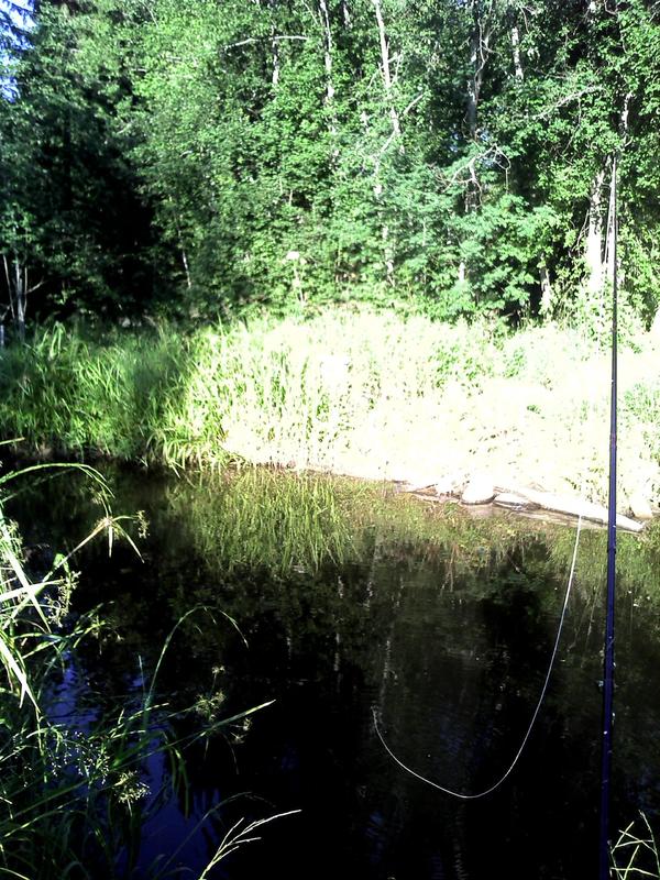 Itse laitoin perhoksi Samilta saaneeni pienen pintaperhon. Uittelin perhoa vedessä, kun siihen kävi jo pieni alamittainen harri. Nopeasti ilman haavituksia kala takaisin ja eteenpäin. Syvässä montussa näkyi muutama harju ja puronieriä. Taisi siellä pieni taimenkin olla. Montusta en vielä saanut mitään, mutta Sami taasen sai pienen harjuksen.