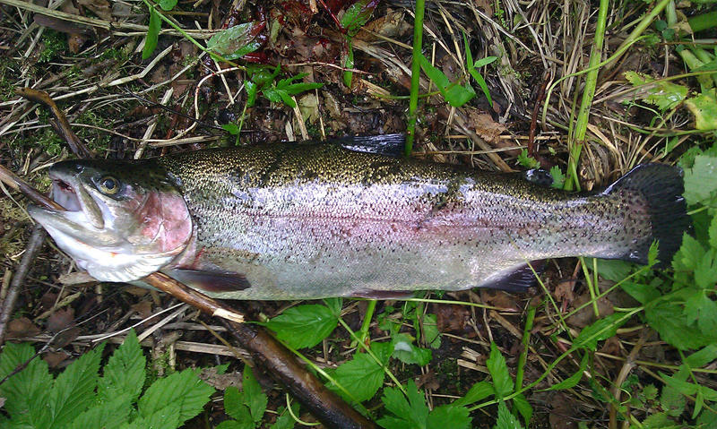 Aivan kalastusalueen latvoilla metodi tuotti viimein tulosta! Perhossa tuntui tukeva tukistus, mutta ei tarttunut pannahinen. Toinen heitto samaa reittiä, ja nyt jäi jopa koukkuun asti. Miellyttävän taiston jälkeen ( ensimmäinen perhovälinein väsytelty kala! ) haavissa lepäsi 36cm kirjolohi. Tässä kohtaa olikin hyvä pitää tauko kalastusksesta ja nauttia evästä.
