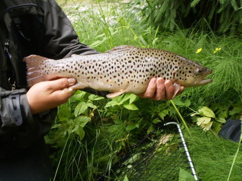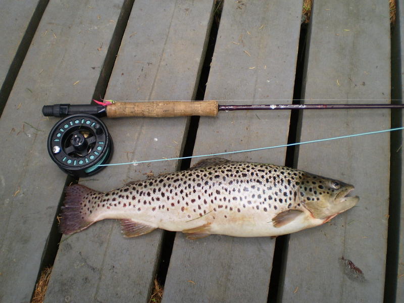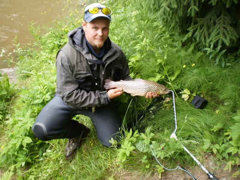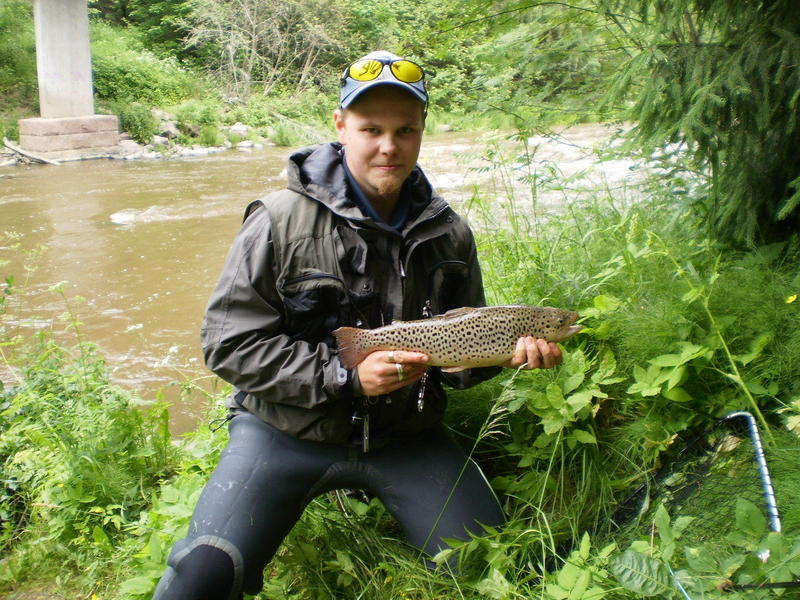 Puolen tunnin heittelyn jälkeen menin virran mukana alemmaksi ja tunsin tärpin vavan päässä jatkoin heittelemistä. Vähän ajan kuluttua pamahti uudestaan ja sain vastaiskun ja sit alkoi väsytteleminen, kala lähti kovasti vetämään kovaan virtaan ja ei halunnut millään tulla ylös lopulta 5 minuutin jälkeen kala joutui haaviin ja osottautui komeaksi taimeneksi. Kala punnittiin ja kala painoi 1.2kg, Sen jälkeen poltin tupakan ensimmäisen perhokalan kunniaksi tänä vuonna:)