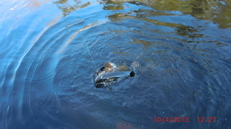 Jatkoin heittämistä ja muutamaa metriä alempana tälläsi toinen taimen kiinni.Tusin heti että nyt ei taida kovin iso olla,ja nopeasti vedin kalan luokseni ja päästin sen kasvamaan,noin 35cm nätti taimenen alku.
