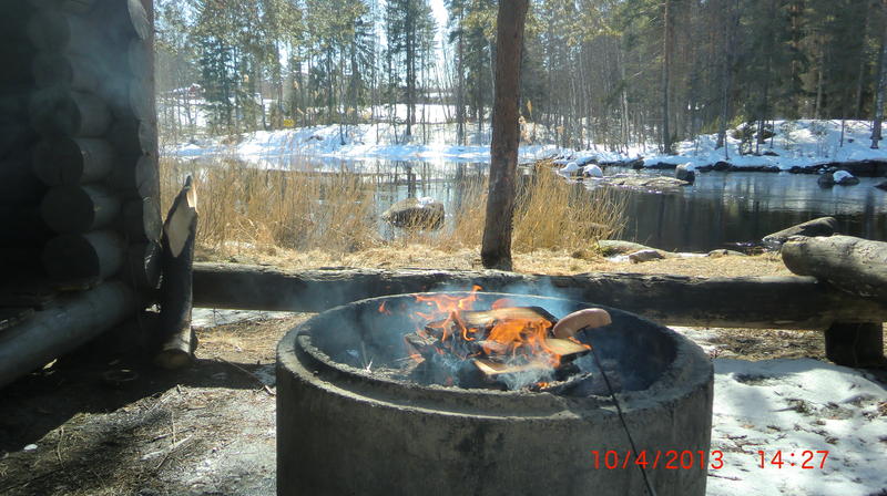 jatkoin vielä heittämistä,mitään ei kuitenkaan siimani päässä tapahtunut joten päätin pitää tauon.Hain autosta makkarapaketin ja termospullon sekä muutaman laudanpätkän ja suuntasin kosken niskalle laavulle makkaranpaistoon.