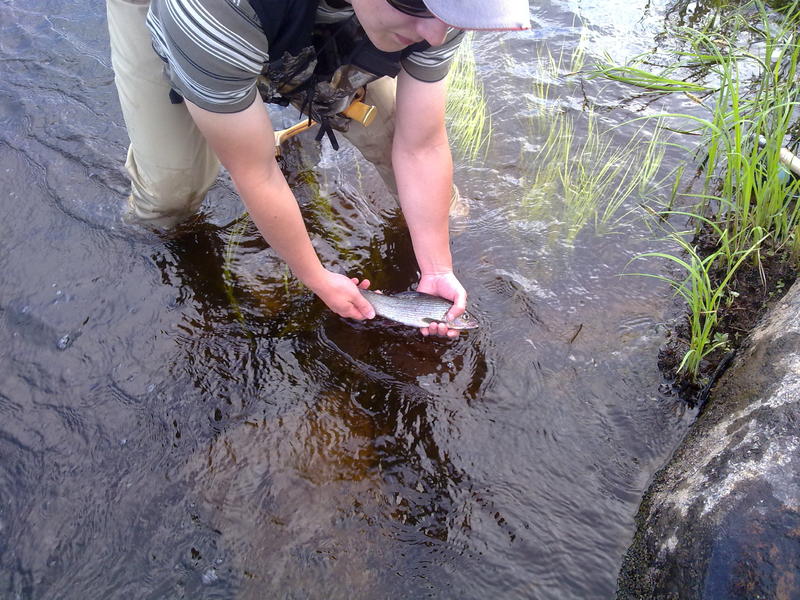 Aikamme kalasteltua vaihdoin siiman päähän kuulapäisen red tagin ja sitten alkoikin tapahtua kun harjus nappasi ensimmäisillä heitoilla, pienet väsytykset ja kala haaviin. Kuvien ottamisen jälkeen välittömästi takaisin vapauteen koska kyseinen harri oli alamittainen(en mitannut mutta raaka arvio 25-30cm). Arvostus oli kuitenkin sitäki suurempi koska en ole ennen Pyhäjoesta harria saanut, olisin varmasti päästänyt siltiki vapauteen sen vaikka olisi sallituissa mitoissa ollut. Tilanteen jälkeen tuli kaksi tärppiä mutta ei haaviin asti tullut kumpikaan. Kirjolohet jäivät siis tällä kertaa saamatta vaikka niitä lähdettiin tavoittamaan.