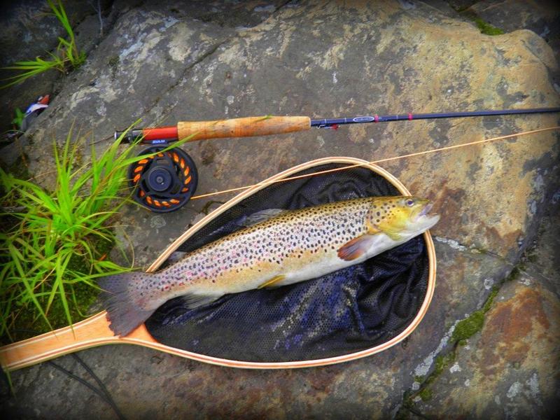 Nakkaan perhon isoon peiliin,kun perho laskeutuu veteen kala hyppää perhoni ohitse. Nakkelen siinä vähän aikaan ilman uutta havaintoa kalasta. Päätän juoda rauhassa kahvit. Siinä samalla vaihdan siiman päähän saman black marabou muddlerin,joka minulla oli aamulla. Nakkaan perhon kauemmas mitä aikasemmin ja silloin kala nappaa. Kala on yllättävän virkeä,mutta 5 minuutin väsyttelyn jälkeen haavissa oli 40cm taimen. Mittasin taimenen nopiasti ja päästin sen takaisin kasvamaan.
