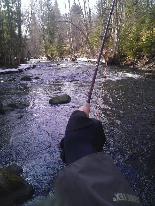 Kesän ensimmäiset reissut ovat lähes poikkeuksetta olleet tyhjän pyytämistä joten tyytyväisesti kalastettiin nytkin tyhjää ensimmäiset pari tuntia. n. puolessa välissä koskea löytyi hieman leveämpi pooli josta löytyi kuin löytyikin kala, joka tarrasi iloisesti koskikorennon nymfiin.