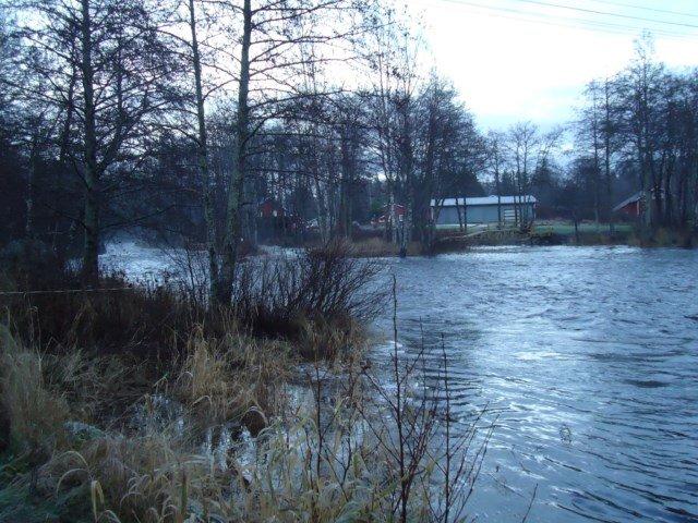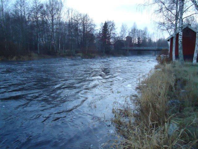 Aamu Holmankoskella;hieman sumua ja pilvistä.Vettä on riittävästi nyt ja nousee joka pvä.Montaakaan paikkaa ei rannalta löydy josta voisi kalastaa kuivin jaloin.Kahluuvehkeet on melkein must.Tänä aamuna olen käppäillyt välisuvannon toiselle puolelle koska virta on hieman rauhallisempi sillä puolella.Pähkäilin että perho saa kalastaa kauemmin(ja upota)eikä voimakas virta tuo sitä heti rantaan jne.Ensimmäiseksi yrittäjäksi sidon siimaan raskaan valkoisen sneldiksen jossa pinkkejä hörhelöitä.En tiedä mikä päähän pisto mutta menköön.Vedän kelalta muutaman metrin heittopäätä ja lumpsautan perhon kastumaan että näkee tarvitseeko koukkua säätää(putkiperho kyseessä).Vasemmalla kädelä kaivan röökin suuhun kun samalla perhoa viedään.Just tätä,edes röökiä ei saa rauhassa sytyttää.No,olio osottautuu pieneksi kirjoksi ja taistelee hyvin.Käyn koppasemassa kalan haaviin ja amen.Kaunis otus tosin joku oli purrut pyrstön yläosasta palasen.Nopea rukous(namu amida butsu)kaatuneelle ja lasku loppuun.Seuraava tunti menee muutaman laskun ja tummia perhoja kokeillessa.Nix acktion.käppäilen toiselle puolelle ja laitan siimaan taas vaaleaa väriä(keltanen).Pienen sivustavirran reunaa uittaessa perhoa riuhtastaan.Kala haaviin kotvan kuluttua ja näppäsen kuvan siitä.Uros kala talviväreissä.Todella kaunis,kuin pakasta revitty!Kaikinpuolin mukava aamu eikä edes vedenpaljous juuri häirinnyt.Että sellasta..