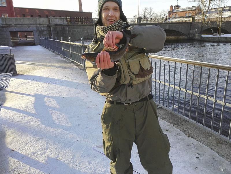 Aikani ruoskin menemään ja mies sitte sai kalan. En nähny mikä lajike kyseessä mutta oli sopivan kokonen, hän päästi sen takasin jatkamaan matkaansa. aamulla kietasin sumpit naamaan lähdin tallustaan kohti Rossoa hakemaan lupia automaatista. Koskenrannan rantaapitkin kun kävelin katselin virtaavaa vettä näkyisikö tuikkeja tai muita merkkejä kaloista, mutta eipä näkynyt. Vesi virtasi suhteellisen voimakkaasti välikoskessa joten suoriltaan lähdin ylemmäs etsimään rauhallisesti virtaavaa paikkaa. Kun tulin oikeustalon kupeeseen, nortin verran tuijottelin veden pintaa ja mahdollisia tuikkeja. Mutta hiljasta oli, silti oli jatkuvasti kutina että kalaa oli koska edeltävänä päivänä sieltä saatiin kala.