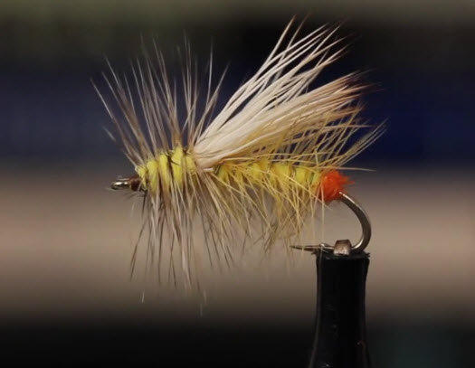 Pidin pienen tauon ja vaihdoin kastuneen ja limoittuneen harmaan pinturin toiseen perhoon. Samanlaista # 6 koon harmaata pinturia ei rasiasta löytynyt. Päädyin lopulta laittamaan kellanruskean, kookkaan ja tuuhean stimulator tyyppisen pintaperhon perukkeeseen. Eikä se ollutkaan huono valinta. Sain tällä perholla aivan kalastusalueen loppuosasta, suuren kiven takaisesta poolista vielä noin 47 senttisen pullean taimenen, jonka vapautin takaisin koskeen. Tämäkin otti perhon viistätettynä, vapaasti kelluttaen se ei kelvannut.
