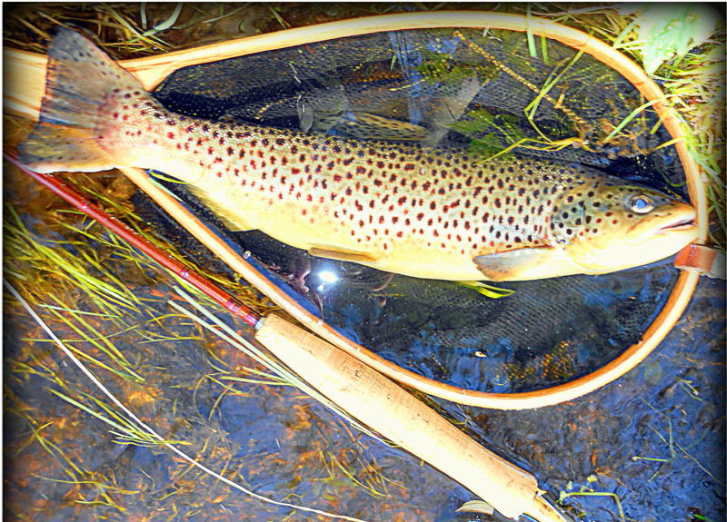 Kala pyöri ensin vauhdikkaasti poolissa edestakaisin, kunnes jumittui monttunsa pohjalle. Väänsin sitä nelosluokan vapa syvällä mutkalla, mutta kala pysyi itsepintaisesti syvällä montussaan. Lopulta vastapeluri hermostui totaalisesti kun pistin sille kunnolla painetta. Se hyppäsi ilmaan ja alkoi puskea alavirtaan kohti koskea. Eipä siinä auttanut muu kuin seurata perässä. Onneksi täpläkylki ei sentään kovin pitkälle alavirtaan syösynyt vaan toppasi suuren kiven taakse. Tässä se junnasi aikansa, kunnes sain sen ohjattua rannan tuntumaan hitaampaan virtaan, josta lopulta haaviin.