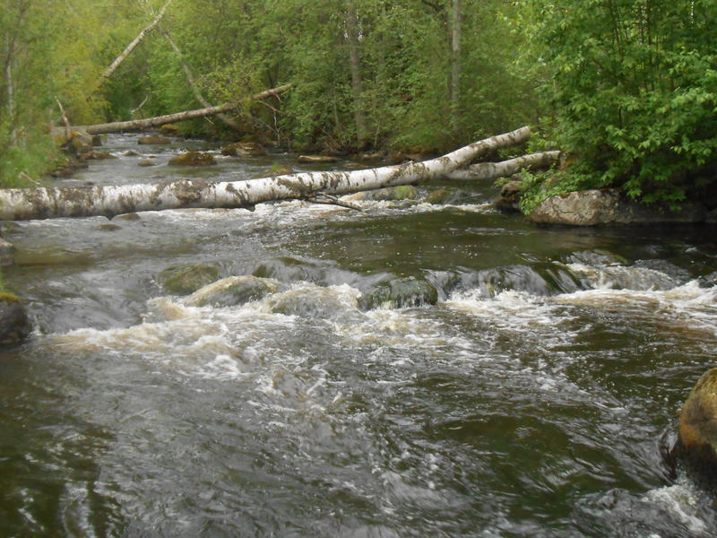 Saavuin noin puolen tunnin kalastuksen jälkeen pikku "poolille", jossa oli matalallakin vedellä kohtuullisen hyvin vettä isommaankin kalan/kalojen asentopaikaksi. Viime kesänä olin saanut paikasta hienon 53 senttisen taimenen streamerilla. Olin varma että paikassa on kalaa nytkin. Poolin kalastusta vaikeutti hieman sen ylle kaatunut suuri koivu. Menin poolin alaosaan ja päätin kokeilla heittää pintaperhoa sieltä ylävirtaan ja haravoida tämän pienimuotoisen paikan ensin pinturilla tarkasti, myöhemmin jos tulosta ei tule, niin syvältä larvalla.