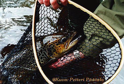 Tässä vaiheessa kutuasuinen naarastaimen on vielä "vapautuskelpoinen" eli on otettu mahd. pian haaviin otin jälkeen ja koukku irrotettu pihdeillä leuasta. Kala ei vuoda verta ja haavin havas ei ole pahimmasta päästä turmellakseen kalan pintalimakerrosta.