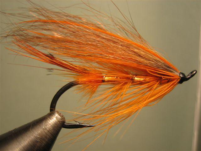Mielenkiintoisen näköinen sidos. Sidoksessa siis yksi kierre kuparinpunainen. Onko siivessä lisänä jotakin pehmeämpää materiaalia bucktailin mukana, vai näenkö harhoja. Alussiipi lienee rungon mittainen. Tuo oranssi siipi näyttää aika ruskealta, johtunee kuvausteknisistä syistä.