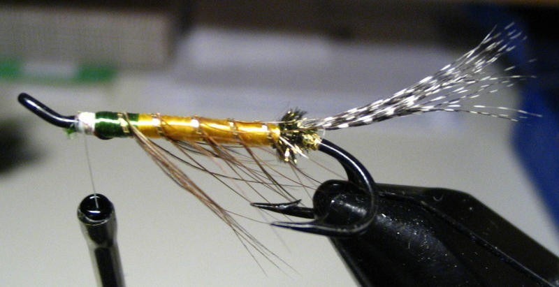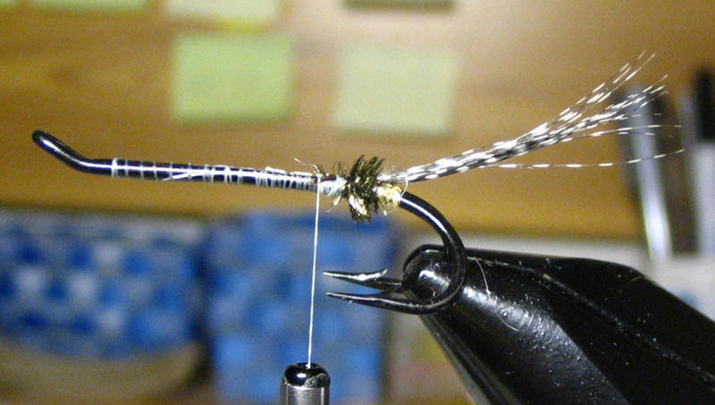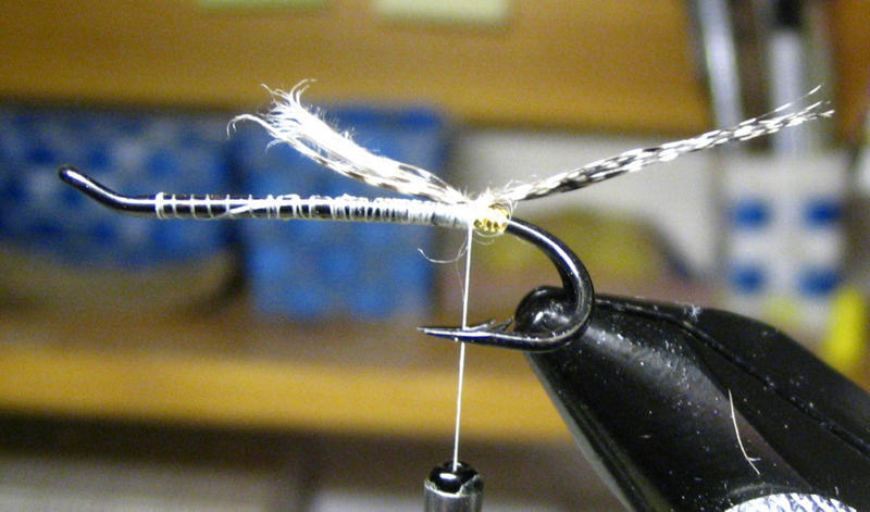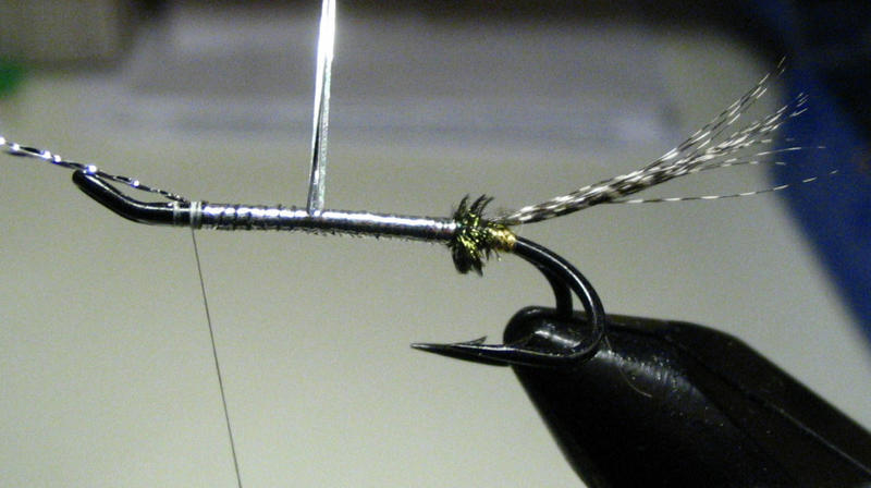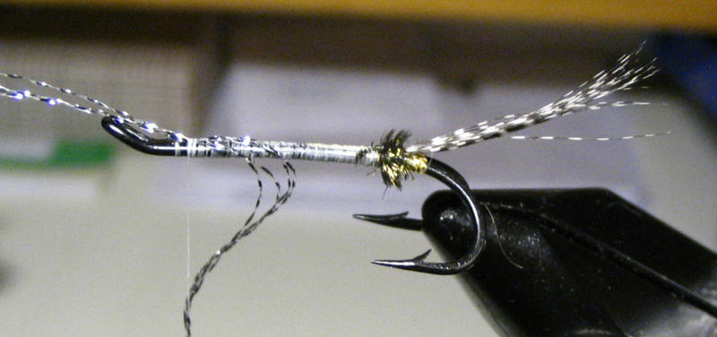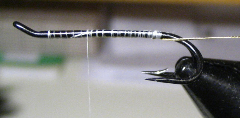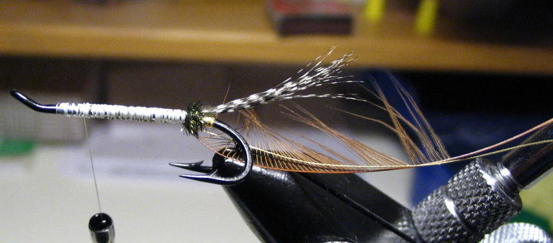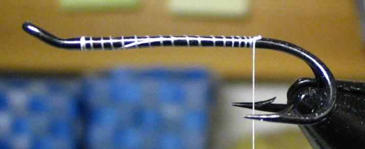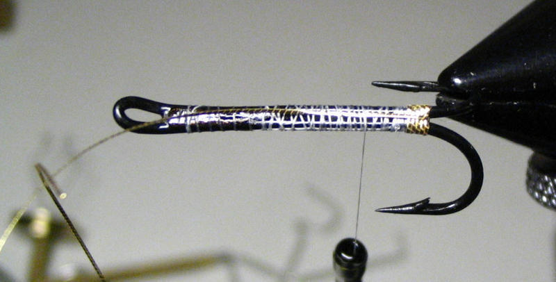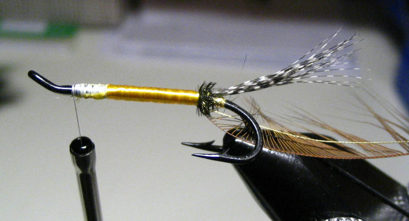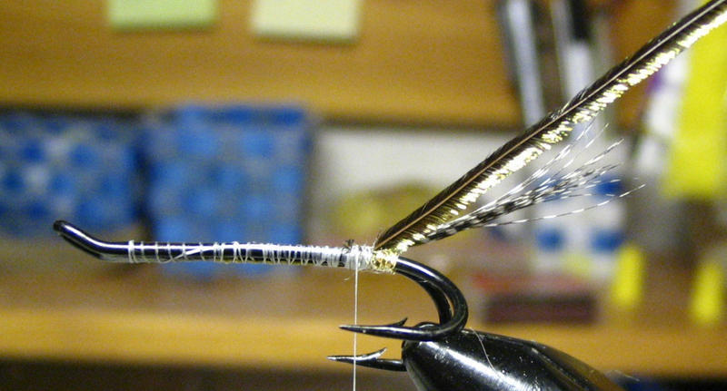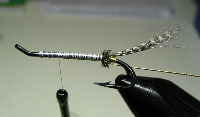 Tuo tinseli oli kyllä tarkoitus laittaa vasta hiukan myöhemmin, jotta silkin saisi sidottua tasaisemmin. Kyllä se tiseli hoitaa tuolltakin käsin virkansa aivan hyvin eli estää sen, että musta koukun varsi pääsisi tummuttamaan silkkiä sen kastuessa. Silkin alla on vaalea pohjustus joten se ei tummu. Tuo pelkkä valkea lankakin riittäisi estämään silkin tummumisen, jos sen kiertäisi tarpeeksi paksulti ja huolella.