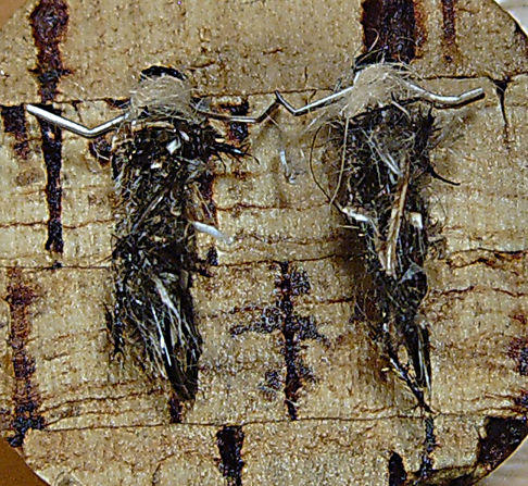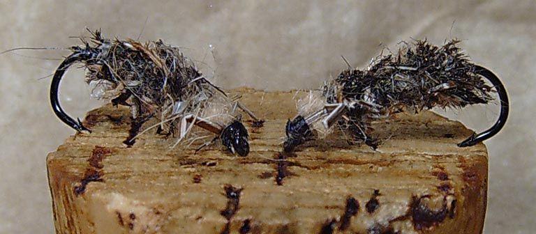Kivan näköisiä perhoja, mutta saisivat näkyä paremmin. Huono tausta tuo korkki, varsinkin alemmassa kuvassa. Larvalta ei tietääkseni löydy tuntosarvia?? Joten kuusi jalkaa noiden "tuntosarvien" tilalle. Jos rungon duppaa sulkaroskasta, kannattaa siihan vetää hyvin harvaan lankakierroksia päälle, tai ainakin lakata koko koppa.