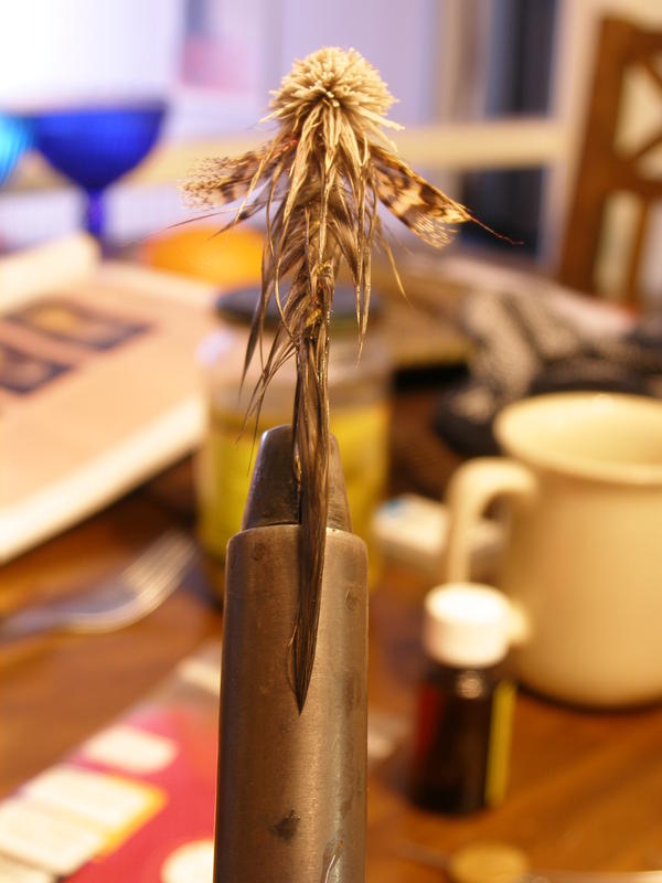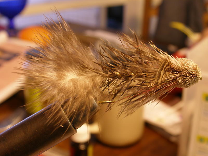 Mianka & Flyffe: En ole koeuittanut yo. perhoa sen kummemmin kuin juoksevan vesihanan alla nähdäkseni, minkälaiseksi perhon profiili muuttuu, kun se kastuu. Aikalailla alemman kuvan näköinen se mielestäni oli vedessäkin ollessaan. Pään jätin tarkoituksella isohkoksi simppumaisuuden esiintuomiseksi-melko iso päähän simpulla on.. Nähtäväksi jää, uiko kys. perho suorassa koskessa ollessaan. Uskon että pyrstön ansiosta ui, jos ei niin sitten saksitaan päätä hiukan lisää.