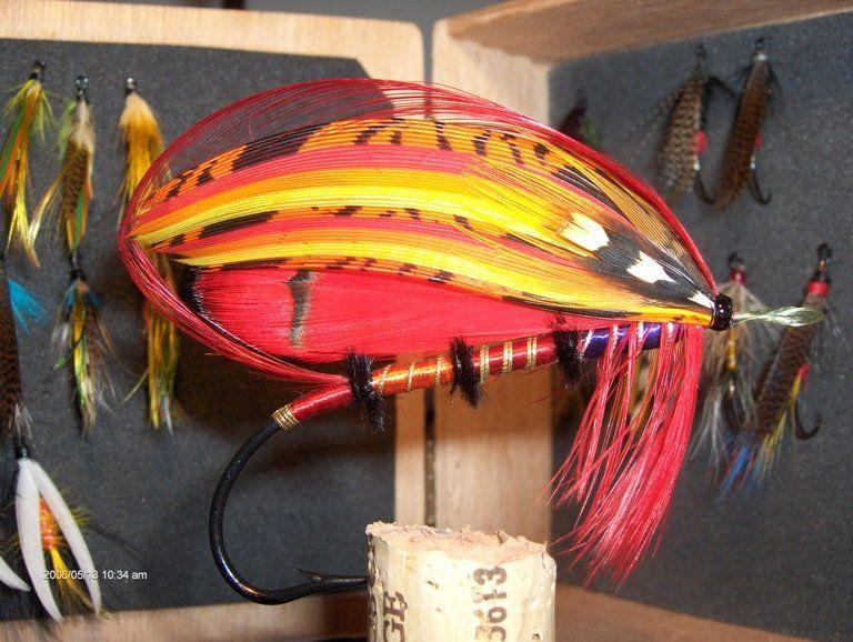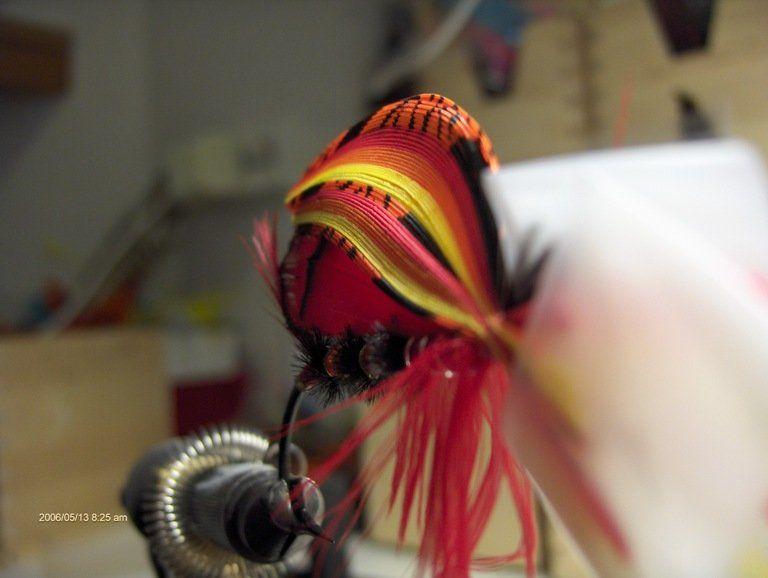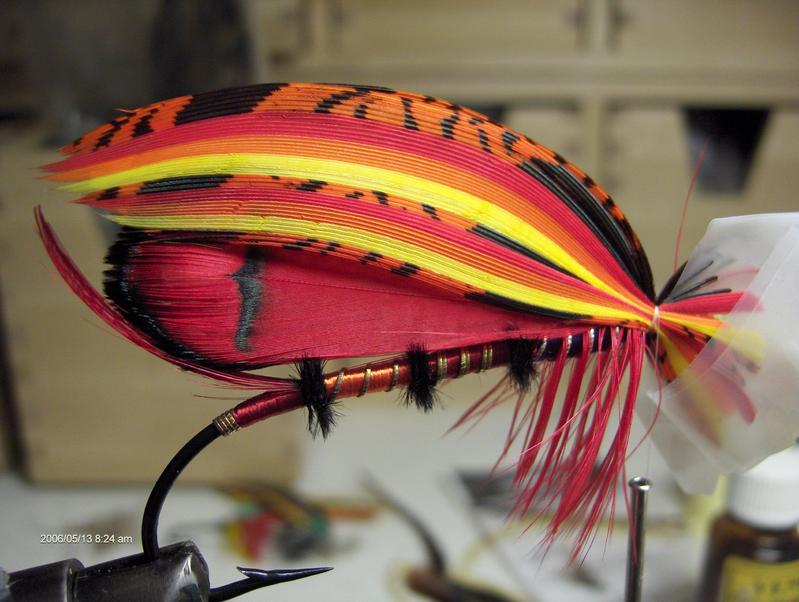 Siipi ja crestit ovat täydelliset - mielestäni. Nokkasilmukka liian pitkä, kierteissä vähän oikomista ja tippettin musta vyön kohdalle ( mistä helkkarista olet saanut punaista tippettiä ?? )Kaikenkaikkiaan tosi hieno tauluperho - pitää itse ruveta vääntään samantyylisiä - kun vaan kärsivällisyys riittäisi. Onnea Perhoukolle tosi hienosta sidoksesta, kyllä tuon kelpaa tauluun laittaa !!