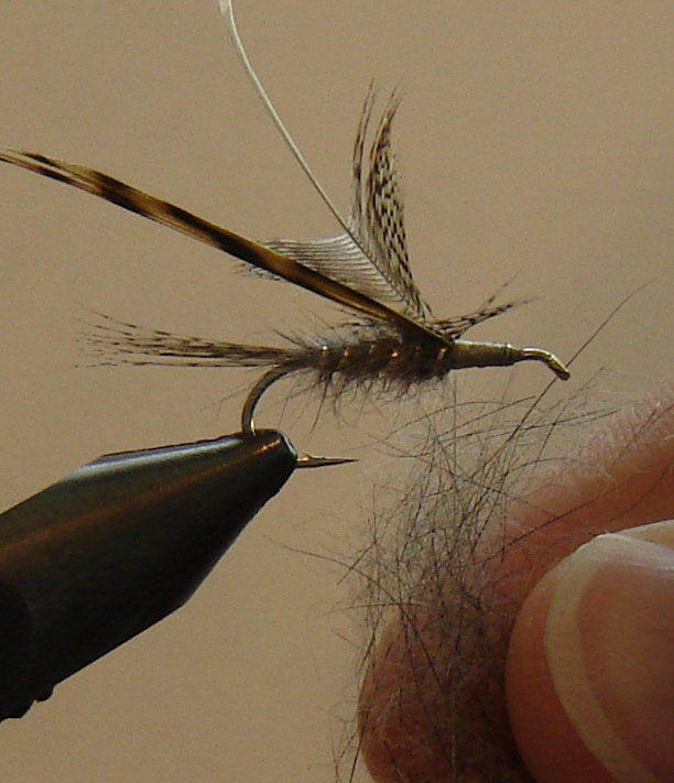Muuten, kävi niin noiden kolmen vaiheittain sidotun perhon (Royal Coachman, GRHE ja Zulu) kanssa, etten ollut muistanut laittaa makroja päälle perhojen kuvaamista varten. Jokaisen kolmen perhon kuvat olivat sameat ja epätarkat (minkä huomasin vasta kuvia tietokoneella tarkastellessani), joten piti sitoa perhot uudestaan ja ottaa uudet kuvat. Tämän GRHE:n kohdalla oli aiempi versio rungoltaan kauniimmin kartioituva, kun taas uudesta versiosta tuli hieman ohkaisempi. No, laiska kun olen, niin en enää kolmatta kertaa viitsinyt ryhtyä kuvailemaan vaikka itse perhon sitominen onkin aika helppoa. Olisi ihan mukavaa, jos voisi jollekin siirtää tuon kuvauspuolen ja saisi itse keskittyä sitomiseen
