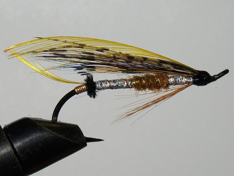 Päästä tulee väistämättä isohko, kun kääntää karvat lukkoon, eli sitoo ne kaksin kerroin, perhon kestävyys paranee huomattavasti kalastuksessa tällä tyylillä. Häkilät olen jo vuosikausia sitonut nippuina ja käännettyinä nekin. Muistelen ettei yläkaari kuulunut aikanaan tämän perhon reseptiin, mutta varsinkin tenolla, Yläkönkään alustalla, Kuusiniemessä ja Borssejoen väylällä tarvitaan siivessä jotain keltaista kirkkaina päivinä, voisihan sen korvata tietysti keltaisella karvalla tässä perhossa.