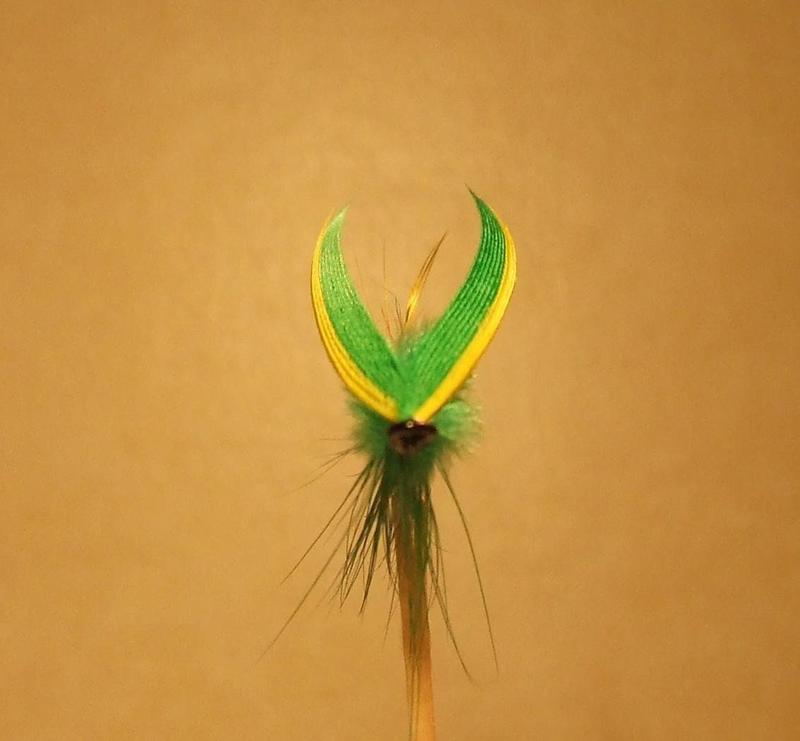 Tekis tähän rungon malliin taaemman osan rungosta joko keltaisesta tai punaisesta silkistä ja tuon etuosan valkosesta strutsista.. Kierteeksi vaikka tuollainen hopea/puna/hopea..?? (tai musta) Tuon vihreän kukon tilalle aina niput crestiä..? Sitten siivet rungon ja kierteen värisistä hanhista..?? Eli jos nyt vaikka kierteenä olisi se punainen, tulisi siipikaistojen keskelle punainen kaista ja niiden sivuille keltaiset kaista naitettuna? (eli siis takarungon väri)