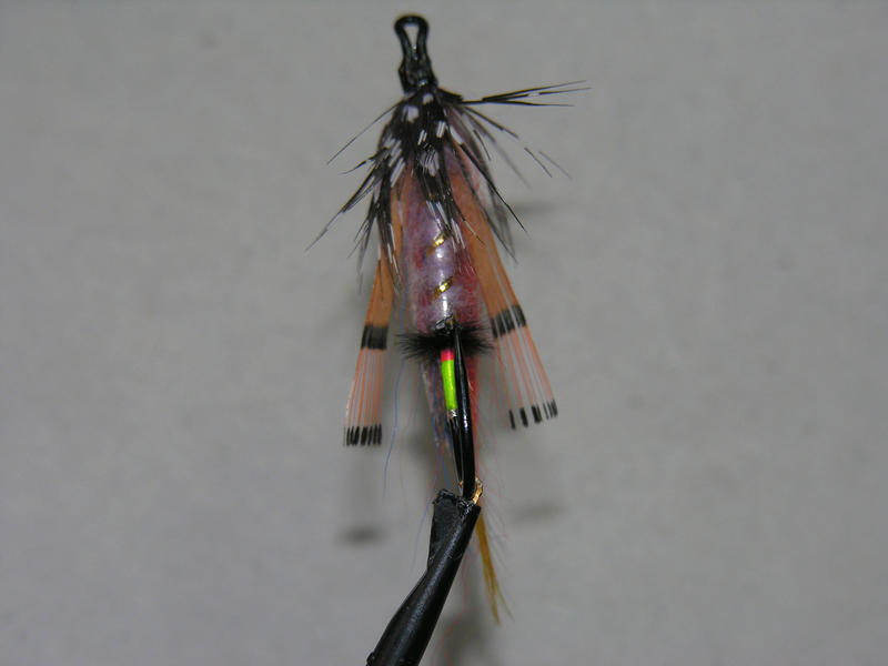 Sidosten silhuetti on tyypillinen sitojalle ja tämä kaksoiskierre näyttää olevan myöskin sitojan "trendi". Tuo vaaleanpunainen suikale tuolla vyön takana kyllä häviää kalastuksessa tuonne vyön taakse, voihan se sieltä heikosti vilahdella esille, mutta jos sen haluaa iskuåisteeksi sitoa se on hyvä tuoda vaikka vyön eteen tai korvata tuo strutsi mustalla villalla tai dubbingilla.