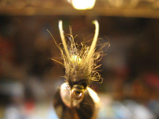 Jokainen tyylillään. Itse vaihtaisin nuo "tuntosarvet" notkeampaan materiaaliin. Sitten vielä ottaisin yläpuolelta tuota eturunkoa vaikka saksilla vähemmäksi ja nyppisin alapuolelta tuulikarvoja jaloiksi. Hienosti sidottu perho kuitenkin.
