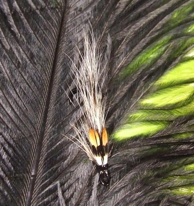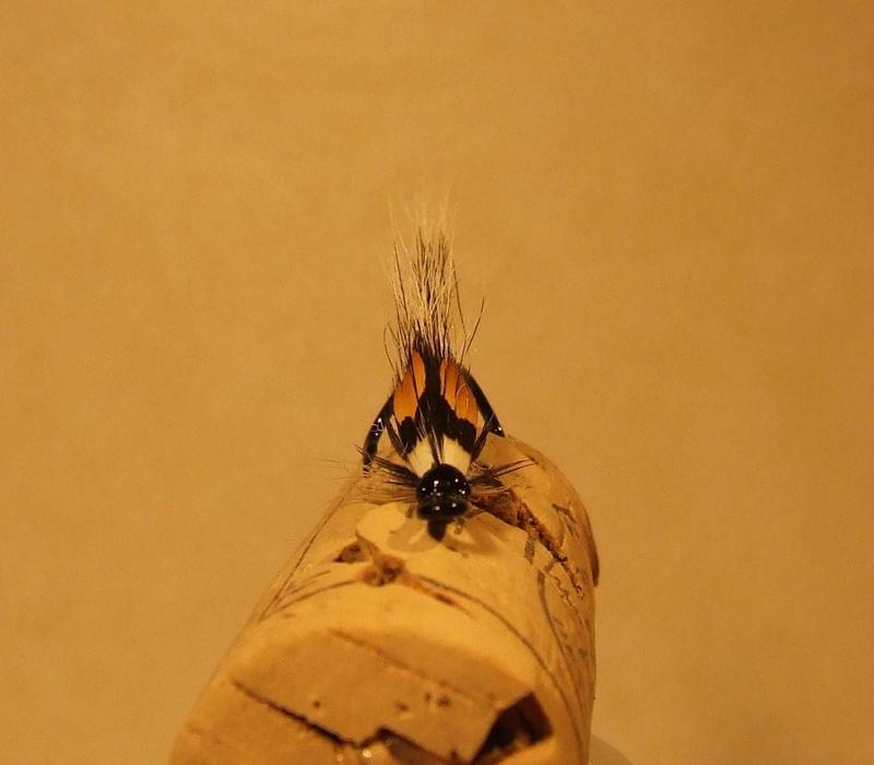 Ehkäpä alkukauteen, mutta ei tuolla värijärjestyksellä. Harmaat on toimineet alkukaudesta, mutta rungossa pitäisi olla hopea iskupiste, kuten tässä hela, sitten tuo sininen ja keulan valkoinen karva, niin näitten järjestys toinen, silloin kontrastit kovia. Vielä kun lisäät siipeen hieman oranssia oravaa 2X rungon mittaisena, niin jopa pelaa alkukaudesta. Ja jos vesi sameaa, niin oranssi vyö. Nythän siitä tuli aivan toinen perho. Mutta tällä kuosilla pilviselle ilmalle ns. vaikeaan aikaan, mutta silloin viidakkokukot pienemmiksi, tai kokonaan pois.