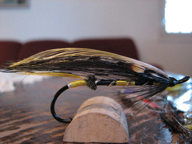 Tällainen keltamusta perho, jossa on vihertävä siipi, on joillakin jokiosuuksilla todella toimiva perho päiväaikaan, olipa sitten aurinkoinen, puolipilvinen, tai sadesää. Kyllähän tuosta eittämättä tulee mieleen (rungosta) Teno 9, vaikkakin hopea puuttuu ja välihäkilät, mutta kuitenkin. Eilen juuri sain paketin Manulta, jossa oli vihreäksi värjättyä fasaania, ja Manu käski rakennella perhon jossa on keltamusta runko ja vihreä siipi, eli joku tällainen.