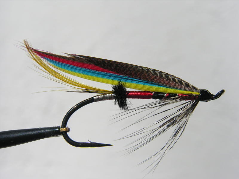 Wanhat Suomalaiset Lohiperhot-kirjan kuvasa ruostunut koukku ja punainen rullalanka herätti mielenkiintoni sitoa tämä. Punamusta on Kymille toimiva yhdistelmä, joten sidoin tämän enemmänkin heittoperhoksi. Korvasi siivestä vaaleanpunaisen hanhen buctail:illa, ruskean kalkkunan sijaan laitoin hanhea.