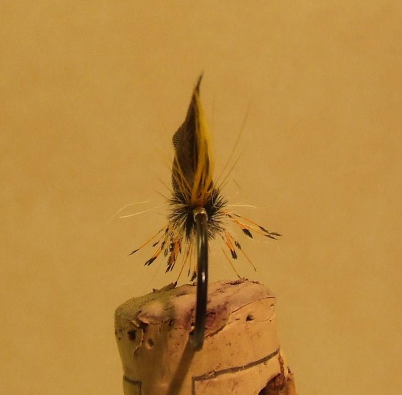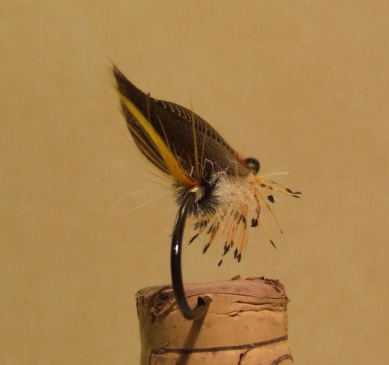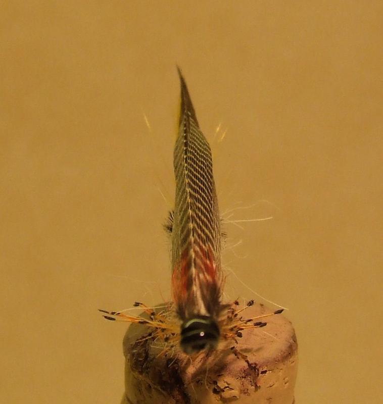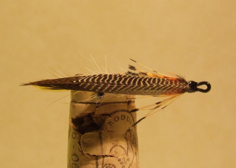 Siipi on hienon muotoinen ja hyvi sidottu, mutta taitaa olla edestä katsoen vinossa? Kuitenkin hieno yhdistelmä. Tuohon kun laittaa silmähöyhenet runkolinjan alapuolelle irti rungosta, taimenet on ihmessään, lohelle jättäisin sidoksen ilman silmiä.