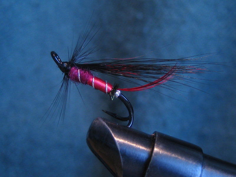 Heinäkuu, veden lämpö alle 15 astetta ja normaali vesikorkeus. Tummalla kelillä, eli pilvisellä ja sadekelillä perhon väriä tummennetaan, mutta se ei saa olla umpimusta. Nämä värit on juuri paikallaan silloin, myöskin voit kokeilla yökalastukseen pilviseen yöhön. Muuten asiallisesti sidottu perho, mutta kun sidot tuon häkilän kaulushäkiläksi, niin häkilän siikasten pitäisi olla samansuuntaisia kuin siiven.