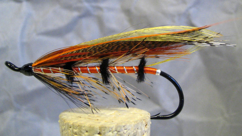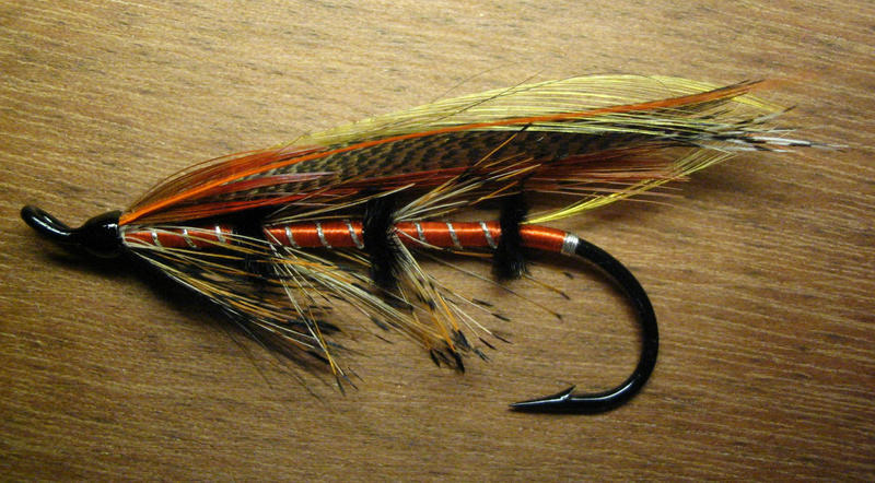 Tämä on ilmiselvä Lohiperho. Kaikki on kohdallaan:sidonta, värit, materiaalit ja niiden sommittelu. Minusta eritoten siipi on hyvin rakennettu Honkavuoren näkemyksen mukaisesti, hänhän oli sitä mieltä, että siiven tulee olla kerroksittain rakennettu, sukkulan muotoinen ja muutama hyvin harjattu liistake on aina hieman pitemmällä, jolloin ne elävät vähäisessäkin virtauksessa hyvin. Oranssit sarvet kruunaavat sidoksen.