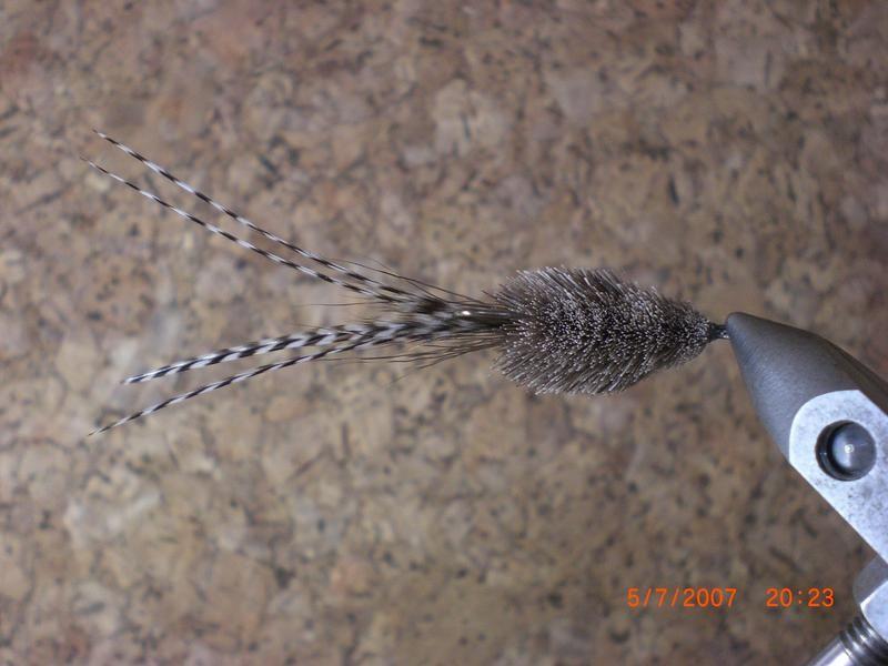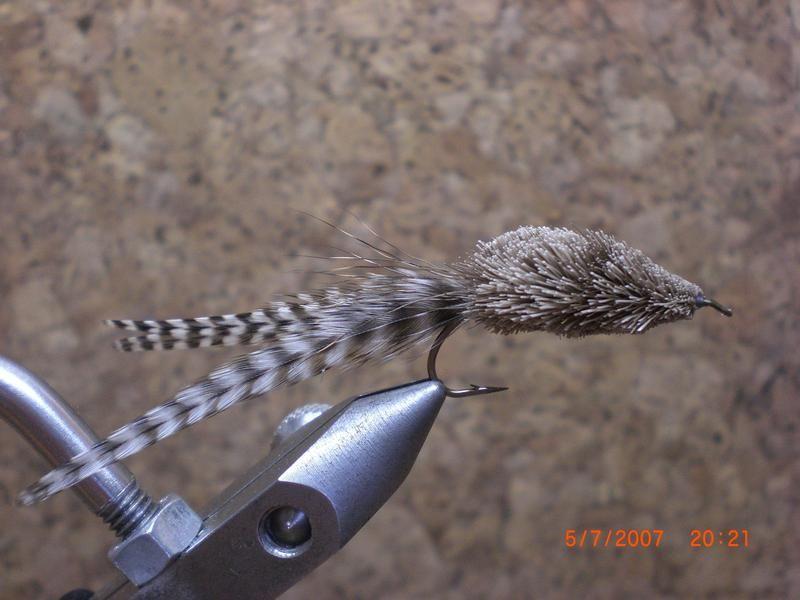 Siispä miksi en kokeilisi hiirijäljitelmässä samaa yhdistelmää:harmaa peurankarva ja grizzle-häkilä.Ja kyllähän se niin on että tuo neljän häkilän häntä on vedessä yksi niinkuin herrat täällä oikein oivalsivat.