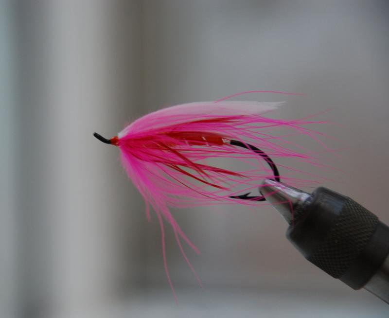 Nyt kun kyttyrälohi on saavuttanut voimakkaampaa jalansijaa tenon vesistössä, saattaa olla rohkeanpuoleista sitoa tämänkaltainen pinkkiperho elokuussa siiman päähän, mikäli ei sitten halua juuri siimojensa koukkuihinsa ko. lohta. Siihen aikaanhan kyttyrälohi on hanakka iskemään vieheisiin. Itsekin olen monesti ihmetellyt tuota täysin punaisen perhon näkyvää poissaoloa tenon perhoista, kun punainen puukala on se mikä siimanpäähän laitetaan kun muuta ei keksi. Kyllä tuosta minullekin ensimmäisenä tulee mieleen kirjolohiperho.