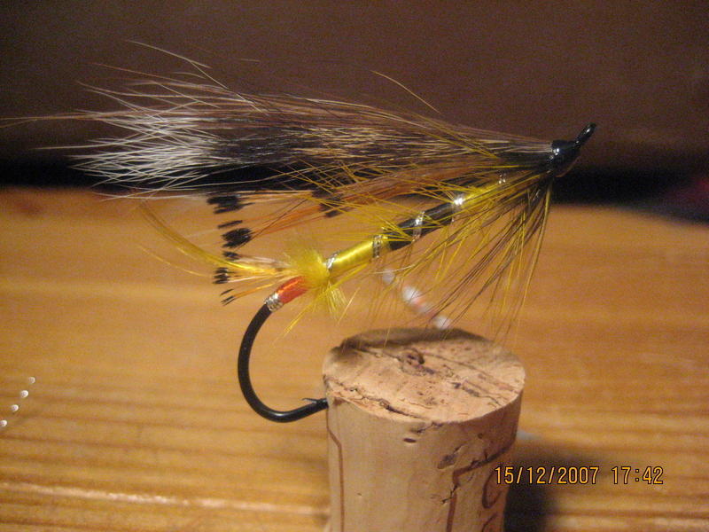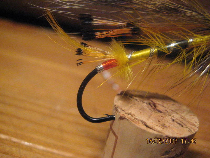 Ihan jees-perho.Toimivuutta en epäile,varsinkin kun luin jutun sen suunnittelijalta.Perhon säveltäjä on varmaankin hakenut keltaista seppelenauhaa runkoon,koska se säilyttää värinsä märkänäkin(jotain keinokuitua tai nailonin tapaista kai se on).En tunne perhoa kuin nimeltä,mutta kontrastivärejä tässä riittää,joten eipä jää lohelta huomaamatta.Joku enemmän kilpasitoja saattaa sanoa päästä jotain,mutta itse yritän tutkailla pyydystä kalastuksellisesta vinkkelistä.Itse laittaisin tippetin niin,että takaraita loppuu mustan palkin takaosaan ja kärkiraita vyöhön.En sitten tiedä onko sillä niin lopultakaan lohelle väliä,mutta jää siitä itselle hyvä maku suuhun kun niin on tottunut tekemään