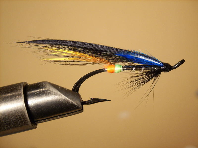 Jos se perho ensi suvenakin vaatii sinistä,niin tässähän on valmis peli.Juuri tuota sinisen sävyä jossa on pitkät ja pehmeät siikaset ei meinaa löytyä mistään,minultakin on äijät kohta vieneet kaiken.Kuningaskalastajalla jos tekee posket,niin ilme muuttuu varsinkin kun tarkastelee perhoa hämärässä.Ne ikään kuin heijastavat fosforimaisesti kun perhoa kääntelee niin,että valoa osuu hieman perhoon.Kaveri kertoi tutkineensa niitä u.v.-lampun valossa ja näyttivät kellertävän!Sitä olen mietiskellytkin,että koska monet eläimet viisaiden mielestä näkevät värit toisin kuin ihminen,niin miksipä ei lohikin.Eli tekisikö joskus juuri "seyksijaainoaoikea" väri/aallonpituus/mikäliekumma kahdesta lähes samanlaisesta perhosta eri oloissa toimivat?Niin tämä perho!..No sehän on tyylillesi uskollisesti hyvän näköinen yhdistelmä Sweepiä,Green Buttia ja Tenon hyvää väriä oranssia.Soipa peli kesäkuun hämyhetkiin,miksipä ei vielä heinäkuullekin jos on kylmähköt kelit.Tässä on jotain Huithapelimaistakin,varsinkin jos olisi Badgeria häkilänä.Kun käytämme tätä heitettynä,voimme nauttia lohta myös keitettynä