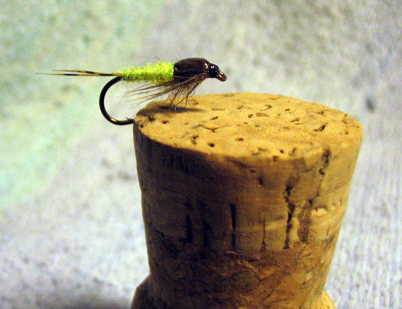 Syksyllä taimenet tuntuivat kelpuuttavan hyvin kirkkaan keltaisia larvoja/nymfejä ateriakseen. Usean version jälkeen tämä vakiintui luottopeliksi.