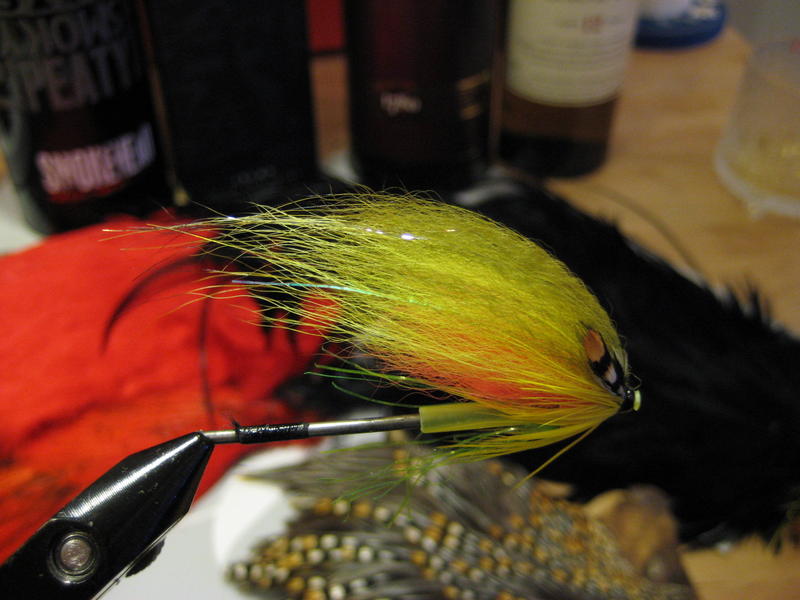 Kiitoksia. Pakko sanoa tässä vaiheessa, esitettyä sidontamallia mukaillen voi sitoa lukemattomia erilaisia muunnoksia, kun siipivärkkiä, kimalteita, kartioita ja putkia nykyään on tarjolla jos minkälaisia. Tällainen Green Highlanderia mukaileva väritys vaan on melkeimpä itsestäänselvyys kun lohta ongitaan kirkkaissa vesissä. Monesti sidon monimutkaisempiakin, ns "Frödiniläisiä" putkiperhoja siten, että piilotan volframikartion häkilöiden ja siiven taakse, samalla kun kasvatan siipimaterialin määrää. Vakauttaa uintia todella hyvin kovemmassa virrassa. Jos putkiperhot ovat jollekkin vielä tuntemattomampi käsite, suosittelen lukemaan Toni Karuvaaran mainion putkiperhoja käsittelevän artikkelin Pohjolan Perhokalastaja- lehdestä, nro 3/2005. Anna mielikuvituksen lentää!