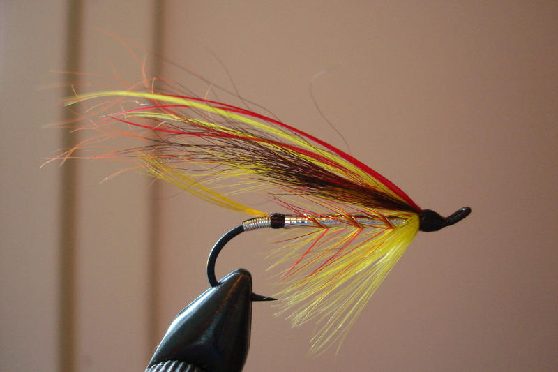 Kyseistä sivustoa selaillessa törmäsin perhoon nimeltä Lohenloukku, josta se ajatus sitten lähti.Erikoisuutena luomuksessani onkin helan kuparikilpi sekä koko koukun selän mittainen sininen kilpi. Jospa se saisi lohet sekaisin :)