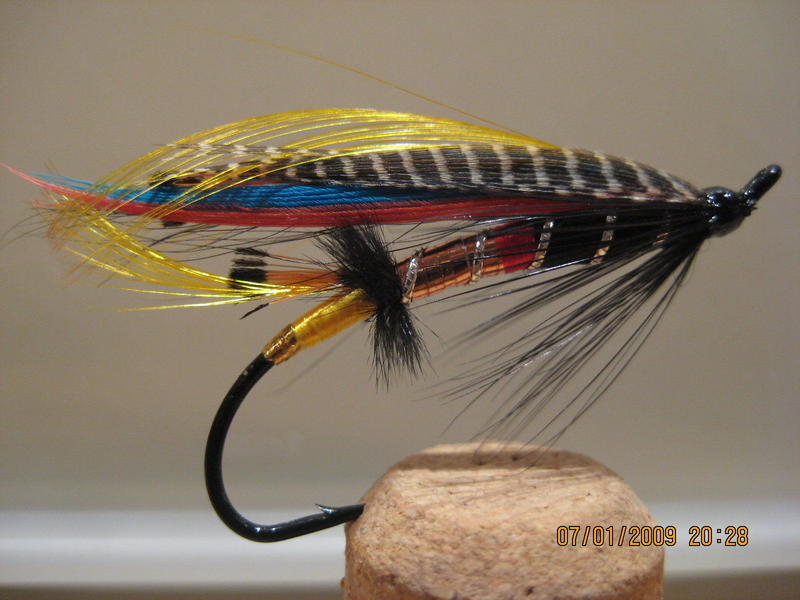 Annan sinulle vinkin esim. tähän perhoon. Säilytä tuo runko, laita peräksi viininpunaista, tai punaista silkkiä, kierre saa olla hopeaa, koskapa elokuussa vesi voi olla hyvinkin matala. Siipeen vaihda tuon sinisen tilalle vaikkapa joku ruskehtava tai musta, mielummin ruskea, silloin alat olla tilanteessa, jolloin sinulla on elokuun alkuun toimiva lohiperho.