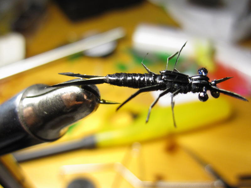 Sen haluaisin sanoa että tuntosarvina noita biotseja ei kannattas käyttää...ovat siihen tarkoitukseen hieman liian jykevää ja jäykkää tavaraa. Silmät saa poltettua häkiläpihtien avulla niin,ettei tuo kiinnitys osa jää noin pitkäksi ja silmät ikäänkuin "roikkumaan" siiman päähän.