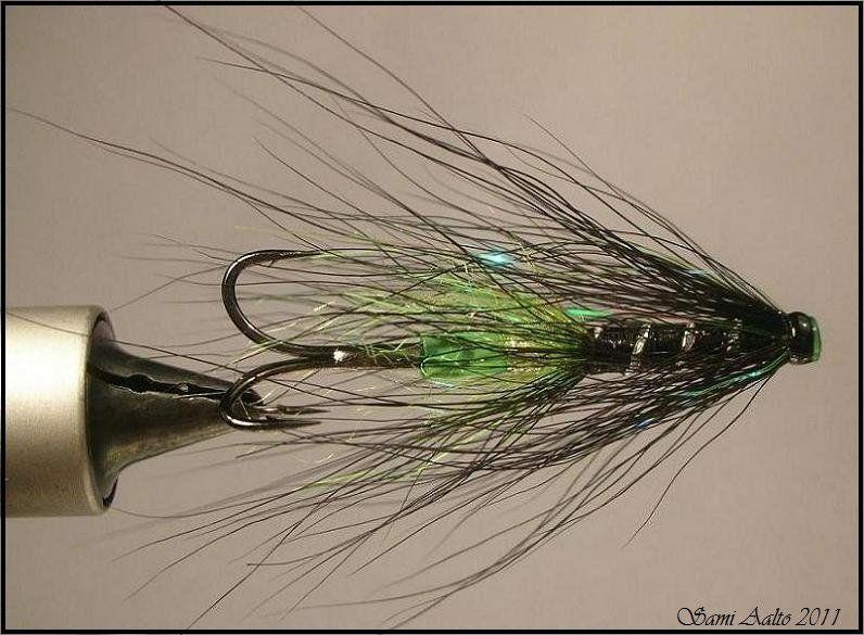 Siis sidot esim. bucktail nipun putkelle 3-4 löysällä lanka kierroksella. Sitten levität nippua kynnellä ja sidonta neulalla tasaisesti koko putken ympäri. Tämän jälkeen pari tiukkaa lanka kierrosta ja hienosäätöä levittämisessä. Nyt voit lisätä karvaa halutessa samalla periaatteella, vaikka eri värejä ja pituus mielellään myös eri niin saadaan elävä siipi. Riittää kun karvat on sidottu noin 2mm matkalla tiukasti kiinni putkelle. Käytän nipun sidontaan korkeintaan 5-7 kierrosta lankaa, näin pää ei kasva isoksi. Nippujen välisssä kannataa ylijäämä karvojen päät leikata lyhyeksi, tämä helpottaa seuraavan nipun levittämistä putkelle kun saa myös karvojen päistä kiinni kunnolla kun alemman nipun karvat ei ole häiritsemässä. Kun siipessä on haluttu määrä tavaraa niin leikkaan karvojen tyvet partaterällä aivan langan juuresta poikki, varoen tietysti putkea ja lankaa. Kun putkeen sulattaa pienen kauluksen ennen sidontaa ja jättää putkea paljaaksi sidontalangalta noin 1mm kauluksesta on karvat helppo leikata siistiksi partaterällä ja saa sidottua siistin pään kaulusta vasten. Varmistan vielä siiven kiinnittymisen pienellä määrällä pikaliimaa karvojen päihin ja tähän pari kierrosta sidontalankaa märän liiman päälle niin tulee siisti ja kestävä sidos. Tuohon takana olevaan siipeen samaa lääkettä, mutta tämänhän saa sidottua koko putken matkalta kiinni niin ei tarvitse liimoja tai muuta vahvistusta. Sidonnassa kannattaa käyttää lopussa niin tiukkoja kierroksia kuin lanka kestää niin saa karvat nousemaan sopivassa kulmassa irti putkesta ja samalla tulee perholle ilmavaa muotoa. Hyvä lanka on esim. Benechin 12/0, kestää tarpeeksi ja on myös sopivan ohutta.