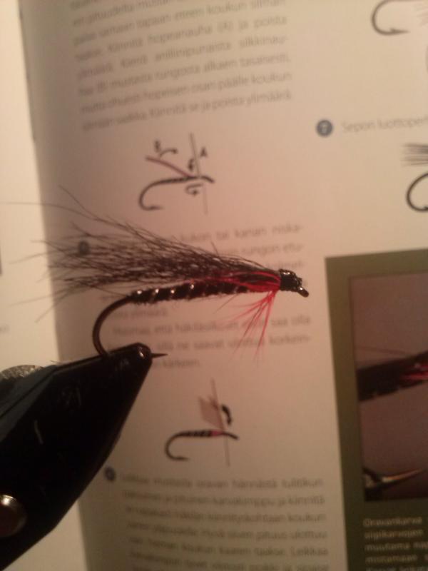 Tarkotin tolla uusimmalla kirjaa Perhokalastus;Hauskoja ja helppoja perhonsidontavinkkejä. Eihän tuo enää mikään kovin uusi kirja ole. Pää tosiaan on vähän suttunen, en vetäny ku yhen lakkakerroksen. Lähinnä kalastuskäyttöön tarkotettu sidos, joten ei mitään kummempia panostuksia tullu tehtyä.