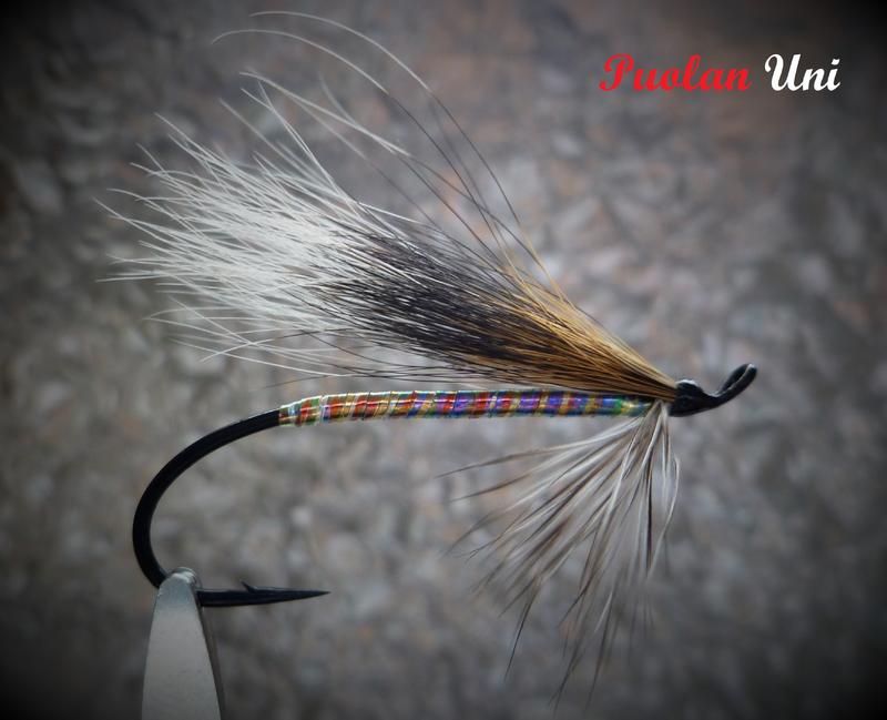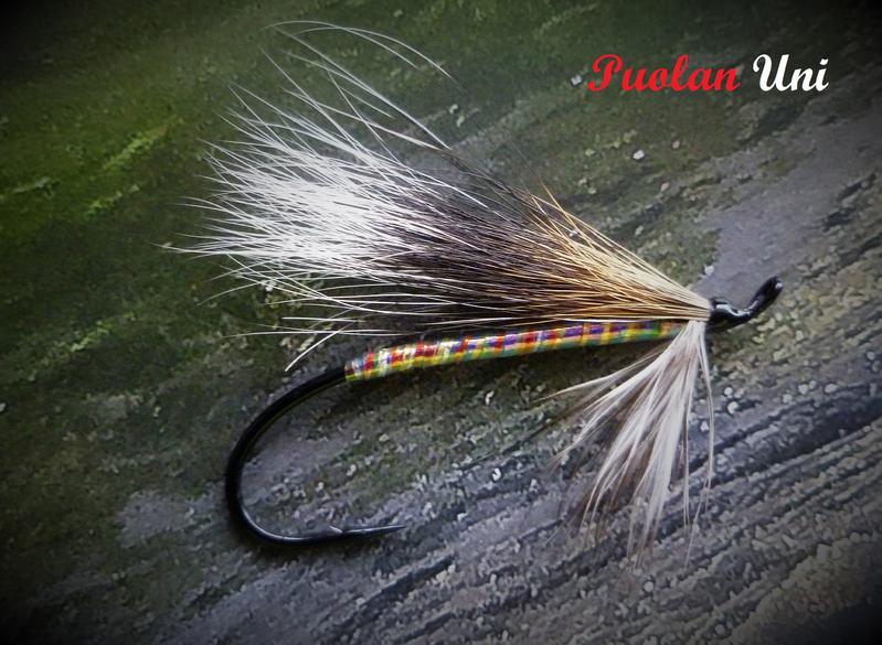 Näin kerran unta lohiperhosta, jossa oli ruskeanharmaa siipi, harmaankirjava häkilä ja helmiäisenä hohtava ja sateenkaaren värejä toistava runko. Herättyäni kirjoitin reseptin muistiin ja nyt parin vuoden jälkeen löysin muistiin merkityn reseptin ja päätin sitoa sen. Koska perho ilmestyi uneeni asuessani Puolassa 2015 päätin antaa sille nimen Puolan Uni.